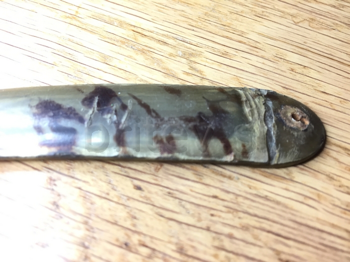po nekaj urah ciscenja (vec gritov za brusenje ter 3 polirne paste) sem ju spoliral do visokega sijaja. Glede n astarost se na rezilih pozna zob casa, globlje raze sem pustil, saj pustijo rezil del identitete (v kolikor bi se to odbrusil ven bi bile britve precej drugacne in grse)